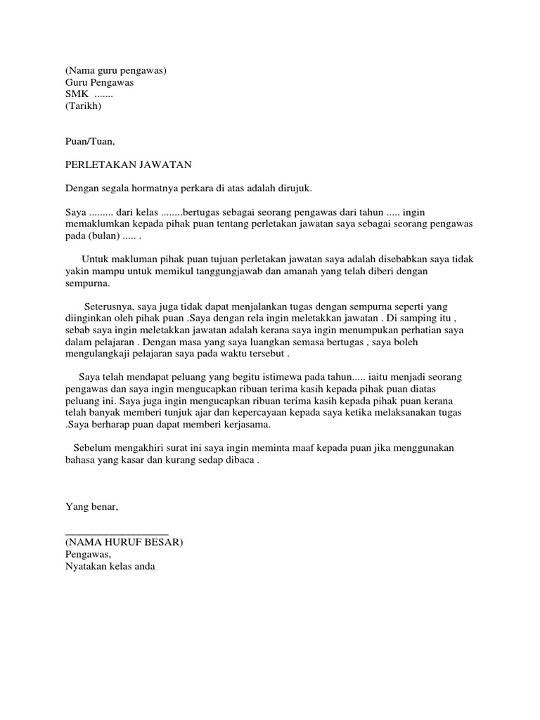 Surat Perletakan Jawatan Sebagai Seorang Pengawas Pdf